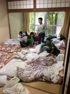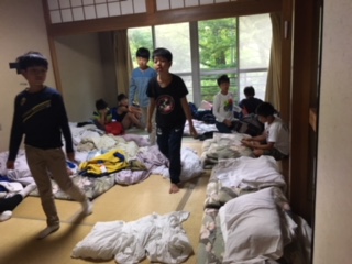 起床時刻になりました。急いで朝の準備をしてください。昨日は、3時位からうるさい部屋があったそうです。今日のハイキング、大丈夫かな、、、
