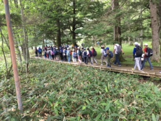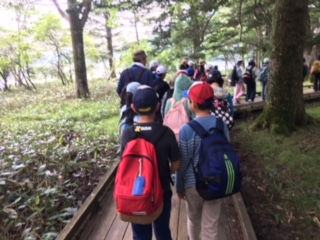 湯ノ湖畔の歩道を経由して戦場ヶ原に向かいます。校長は最後尾で熊と格闘します。