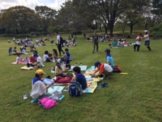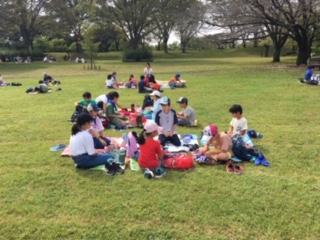 かなり遅れてお弁当です。緑の芝生が気持ちいいです。