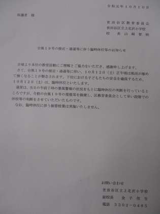 12日(土)は、台風接近にともない、休校に決まりました。全区的な対応になります。ご理解とご協力をお願いします。なお、BOPは休止です。学童については応相談となりますので、新BOP にお問い合わせください。