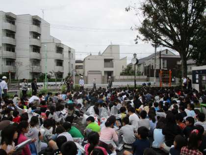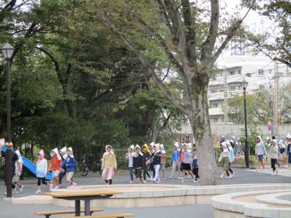 今月は2次非難の訓練をしました。線路の向こうの上北沢公園に避難しました。