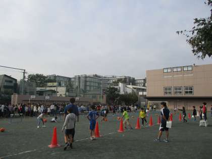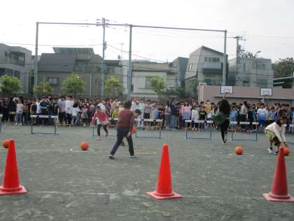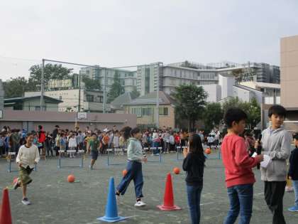 今朝の集会は障害物競争でした。なかよし班ごとのチームでゲームを楽しみました。
