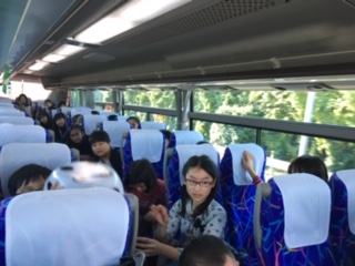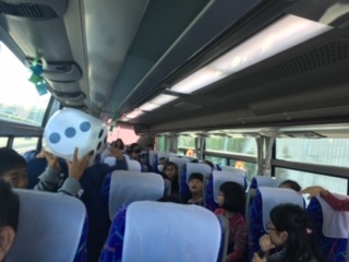 バスレクで盛り上がってます。パプリカを熱唱。左側に富士山が見えます。