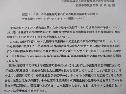 文部科学省より、学習支援コンテンツポータルサイトの開設のお知らせがありました。通称「子供の学び応援サイト」とのことです。どうぞご活用ください。よろしくお願いします。