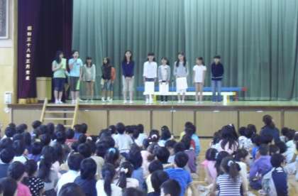 集会委員が数人で一度に言う言葉を当てるゲームで、とても盛り上がりました。みんなで耳をすまして問題を聞き、集会委員が正解を発表すると、「やった〜!」「え〜!」などの声が聞こえました。とても楽しい集会でした。