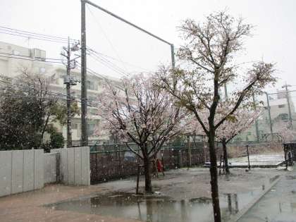 昨日のなごり雪は、結構積もった割には一瞬で終わった感じでしたね。スクールコリドーわきの花壇の花たちは、朝は花びらを閉じていましたが(2枚目写真)、だんだんと開いてきました(3枚目写真)。雪から身を守るために自衛策をとるんですね。今の私たちと一緒だな・・・本当の春が来るまでは・・・