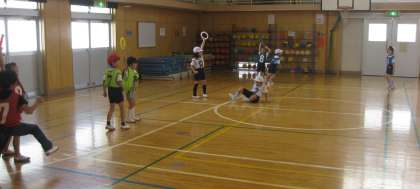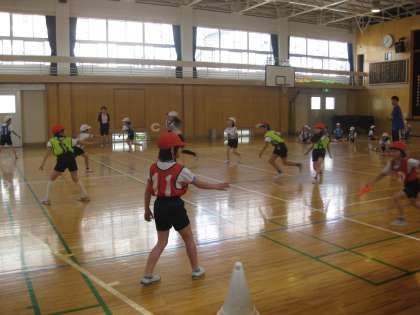 運動会のプログラムに1〜3年選手による「赤白対抗リレー」があります。各クラスから男女4人ずつ選ばれた児童が出場します。低学年にとってトラックを走ったり、バトンをつないだり、難しいことばかりです。給食準備中に体育館に集まって練習しています。3年生が1,2年生に声をかけながら、担当の先生の指導のもと楽しく、真剣にバトンパスの練習をしています。
