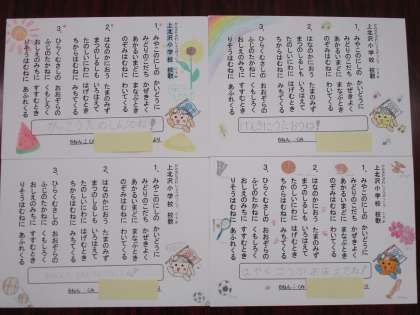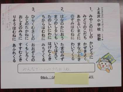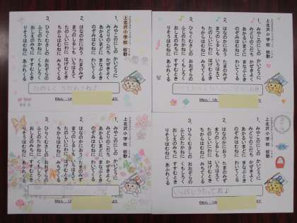 先週、音楽で「校歌のひらがな歌詞カード」を書きましょうという課題を6年生に出しました。5月18日(月)に早速提出された歌詞カードの一部を紹介します。