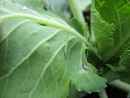 写真:モンシロチョウのよう虫です。理科の授業(じゅぎょう)では、このよう虫を観察(かんさつ)する授業(じゅぎょう)もあります。お楽しみに!
