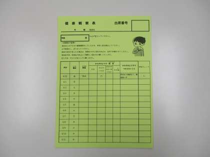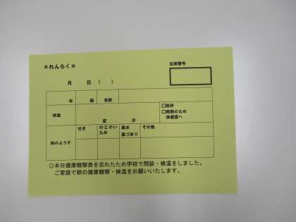 写真中:6月からは、1か月使用する健康観察カードを使用します。各グループの分散登校初日に配布します。*出席番号、記名等お願いします。