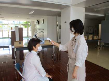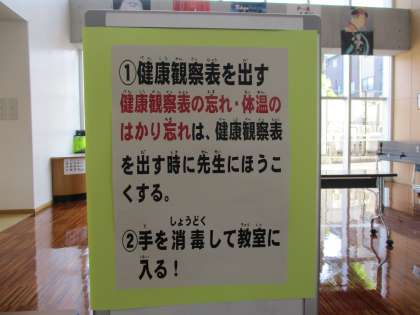 1つ目は、登校前の検温等のお願いです。学校では、教室に入る前に健康状態の確認をします。1階ホールや1階の廊下でけんこうかんさつカードを提出してもらいます。万が一忘れた場合は、検温をしてから教室に行きます。カードは、ランドセルのなるべく出しやすいところに入れていただけると助かります。