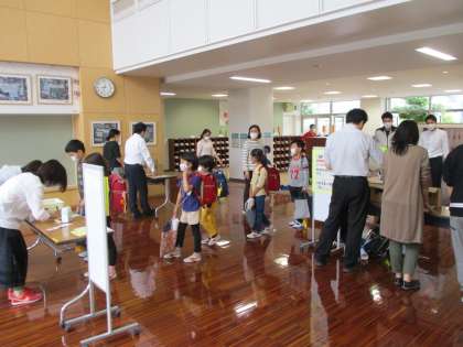 写真は朝の登校時の様子です。教室に入る前に、健康観察カードを提出することになっています。ご家庭での健康観察、検温等、引き続きご協力お願いします。