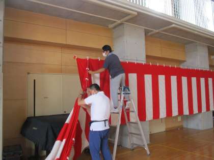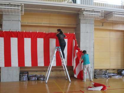 土曜日の入学式に向けて準備をしています。体育館には紅白幕が張られました。当日が楽しみですね!