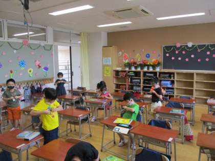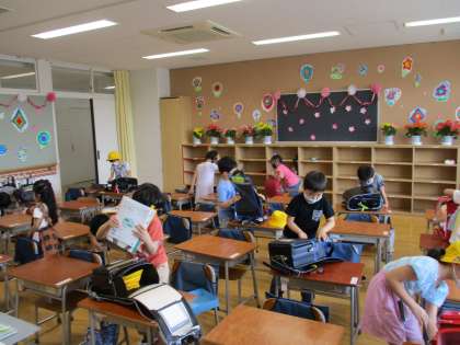 下校の準備の様子です。名札の取り外しも上手になってきました。