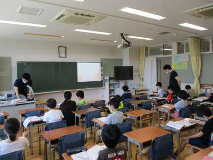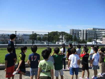 朝の会や社会科、算数の授業の様子です。屋上は天気のよかったし、気持ちがよかったです!