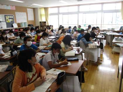公民の分野の学習です。集中して取り組んでいました。最高学年ともなると、ノートも一人一人の工夫が見られます。