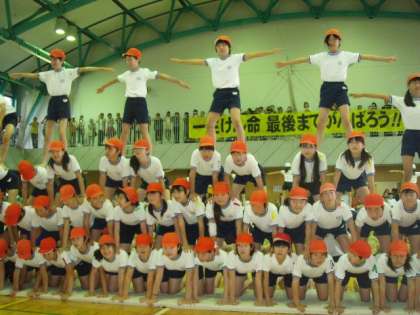 5,6年生の組み体操『TEME KIMISHOU〜歓喜の空〜』では、どの技も心を一つにみんなの協力でつくり上げました。すべてのタワーが立ち大成功でした。1〜4年生の座席では、「すごい」「すごい」の連発でした。体育館いっぱい、感動でつつまれました。