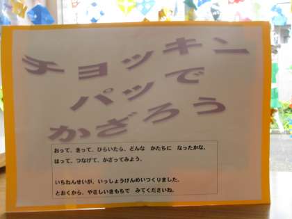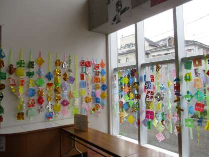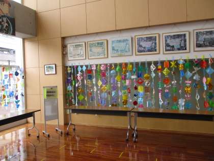 1階いちょうホールに1年生が図工で作った作品が飾られています。
