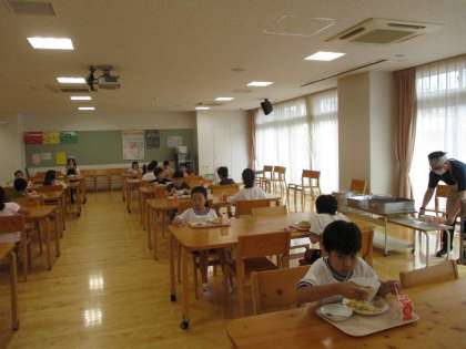 3年生は今週から、各教室とランチルーと各教室の4か所で分散給食にしました。パーテーションをしない分、かなり距離をとっています。