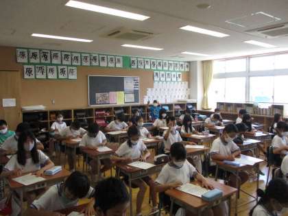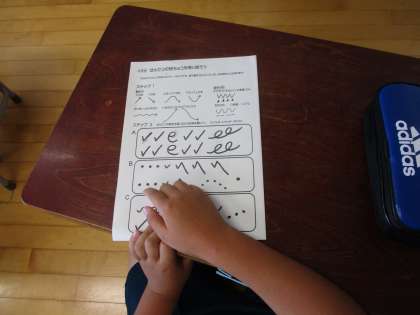 1時間目に50m走のタイムを計りました。2時間目の音楽の様子です。曲を聴いて、図形を指でなぞります。楽しい試みですね!