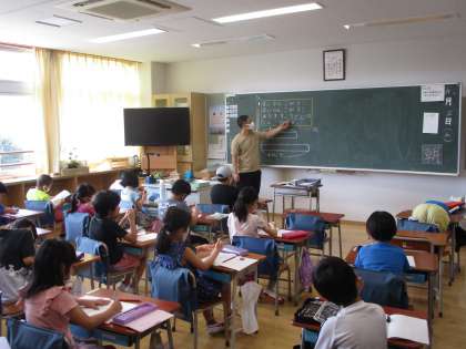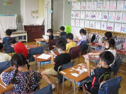 1年生は算数でひき算の学習、2年生も算数の授業の様子です。1年生は、ひき算カードを作っていました。