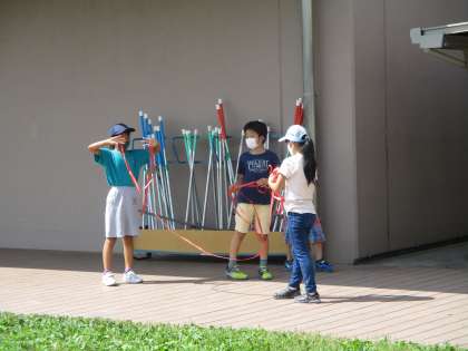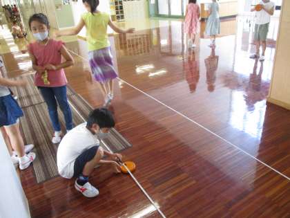 長さの学習で、みんなで協力して廊下や外でいろいろな長さを計っていました。