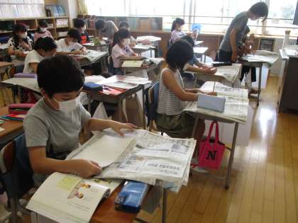 4年生はテスト、5年生は国語で新聞記事を読んで、自分の意見をもつ学習でした。