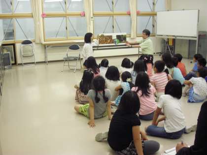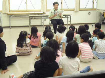 おもしろい「素話」をいくつか聞かせていただいたり、ダンゴムシに関する大型絵本を読み聞かせしていただいたりした子どもたちは、笑顔いっぱいに聞き入っていました。