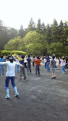 二日目の朝です。みんな元気です。朝会で体を動かしてから、朝食。いい天気です。登山に出発です。