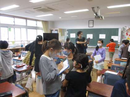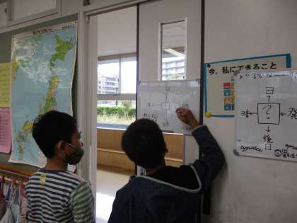 自分たちで作った問題を貼りだして、みんなが解きます。解いたら出題者のところへ・・・楽しく学習していました。