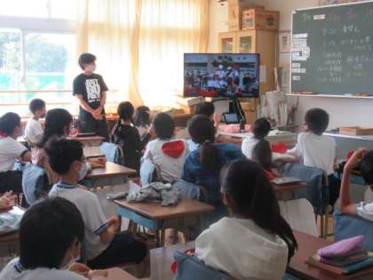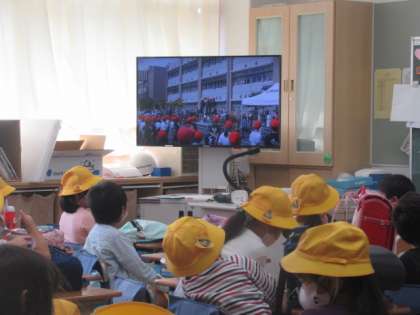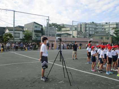 今回の運動会は、学芸会のように2日開催で児童日と保護者日に分けるという異例の形で行いました。校庭に子どもも保護者も一堂に集まることがままならなかったために、校庭の様子を各教室のテレビで観る方法を撮りました。保護者日のはじめの会、閉会式を主に中継しました。新型コロナの影響で集会が行えない中、区の協力を得て各教室のテレビで中継が観られるように工夫しました。