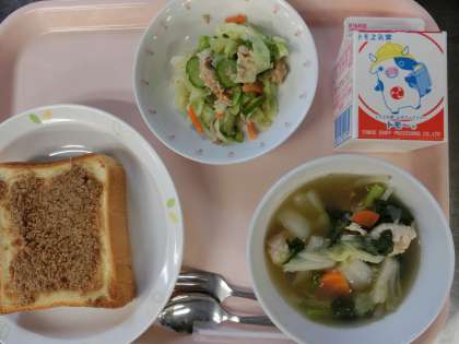 今日の給食は、“おだんごスープ”の 本より、おじいさんが作ったおだんごスープを給食室で作ってみました。