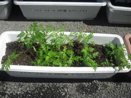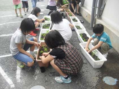5月にまいた種は、クラスみんなで水やりなどをして大事に育て、芽がすくすくと育ちました。芽が元気よく育ったので、6月になって、黒ポットからプランターに植えかえをしています。これから大きくなり、きれいな花を咲かせてくれると思います。
