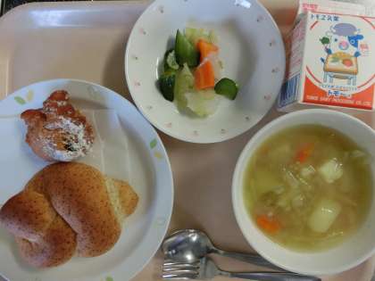 冬の寒い季節によく食卓に上る“エルテンスープ”は、本来、乾燥グリーンピースがたっぷり入った、マッシュポテトのようにどろっとした重たいスープなのですが、給食ではグリーンピースを苦手とする子供が多いことから、使用は控えめに、少しグリーンピース味のスープに仕上げました。