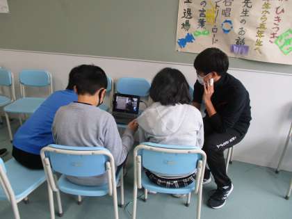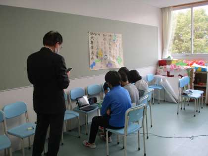 例年は、緑丘中学校に学び舎の3校の小学校(上北沢小、経堂小、八幡山小)の児童会の子どもたちが集まっての交流会ですが、今年はオンラインによる交流会になりました。