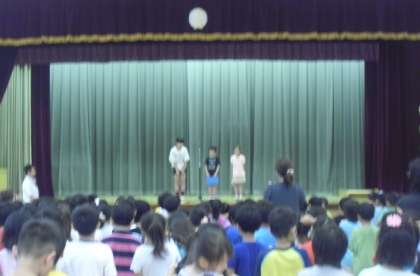 1,3,5年生の代表の子どもが、1学期にがんばったことを元気よく発表しました。その後、教室で担任の先生から一人一人に通知表を渡しました。