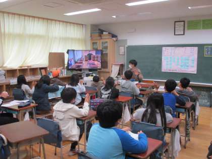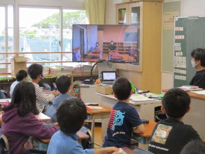朝学習、ワールドタイムで全校テレビ放送をつかって学習しました。