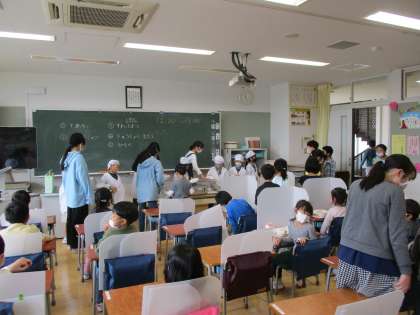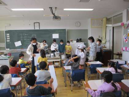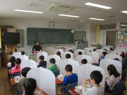 今日が1年生初めての給食でした。感染症予防でパーテーションをつけて、おしゃべりをしないで食べています。さて、お味はいかがでしたか?