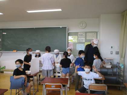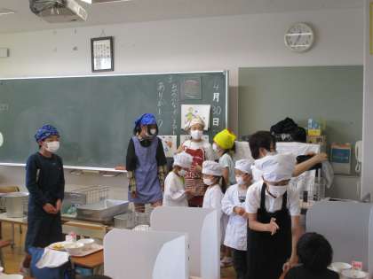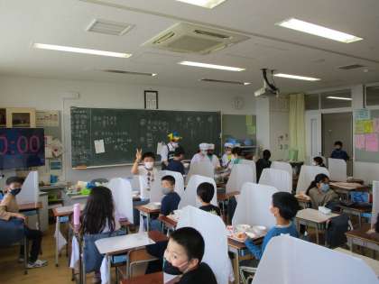 1年生、4年生の給食準備の様子です。6年生の子たちが1年生のお手伝いに来てくれています。ありがとうございます。