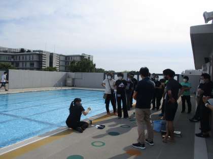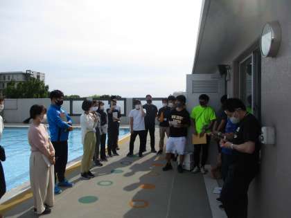 放課後、先生たちがプールサイドに集合して水泳指導上の確認や機械の操作について研修をしました。安全に水泳指導ができますよう、ご協力お願いします。