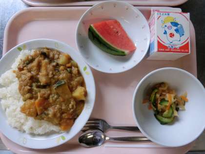 夏野菜がたくさん入ったカレーです。子どもたちの苦手な苦みのあるゴーヤもカレーの中に入ると気にならないようです。
