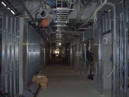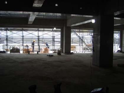 新校舎の建設は着々と進んでいます。シートに覆われているため、外からは見えませんが、鉄筋コンクリートの部分は、だいたいでき上がりました。現在、内部の配管や設備の工事が行われています。エアコンやIT機器設置のため、多くのパイプが見えています。