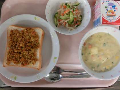 今日は、キーマカレーがのったトーストです。トーストには無塩パンを使っています。