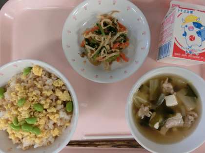 今日は、炒り卵、枝豆、鶏そぼろで、三色ごはんを作りました。鶏そぼろには、凍り豆腐をミキサーで細かくしたものを少量 一緒に混ぜ込んで、植物性たんぱく室も一緒に摂取できるようにしています。