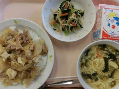 今日は、豚肉と豆腐を玉ねぎなどの野菜と一緒に甘辛く煮付けた肉豆腐をご飯にのせた丼ものです。どんぶり茶碗に盛りつけて、お箸で食べてほしいところですが、給食では平皿に盛りつけます。