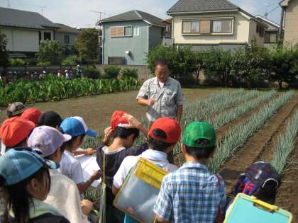 9月14日(水)、3年生は畑の見学に行きました。社会科の「農家の仕事」の学習です。場所は、上北沢3丁目にある畑です。住宅街の真ん中にある広い畑にびっくり。今は、野菜など12種類をつくっているそうです。ナスやピーマンがおいしそうに光っていました。子どもたちは、ご主人の説明を聞き、「ネギはいつごろ収穫するのですか?」などと熱心に質問してメモしていました。地域で農家の仕事の学習ができることは、大変ありがたいことです。調べたことは、新聞にまとめる予定です。