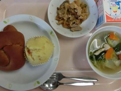 旬のりんごを使って、りんご蒸しパンを一つ一つ手作りしました。給食室で、りんごをいちょう切りにして、小麦粉、バターや卵などとともに混ぜ合わせ、スチームオーブンで仕上げます。やさしい甘さの蒸しパンです。