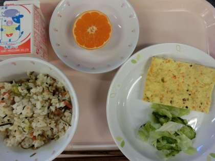今日の給食さらさ豆腐は、断面が更紗模様にみえることから、そのような名前が付いたそうです。断面が見えるように、カップでの配食ではなく、大きな天板に流しいれてカットして配食しています。