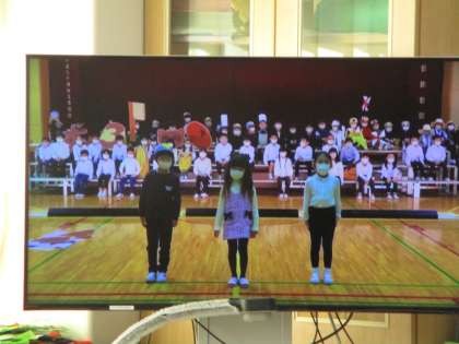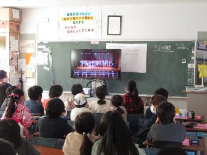 体育館と教室に3学年ずつ分かれての鑑賞です。オープニング集会は全学年テレビ鑑賞でした。
