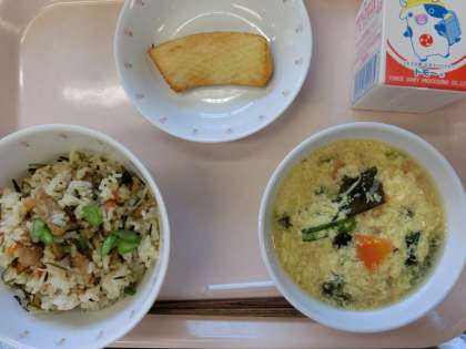 今日は、3種類の海藻が献立の中に入っています。磯おこわの中には、ひじき、すき昆布、そして、かきたま汁には わかめが入っています。